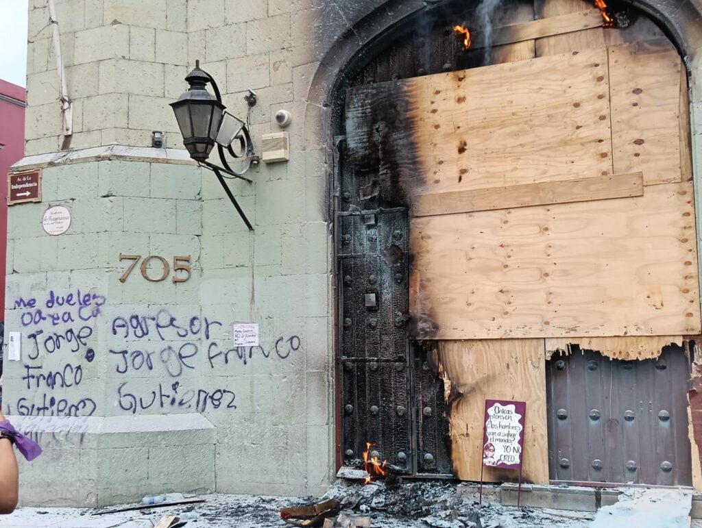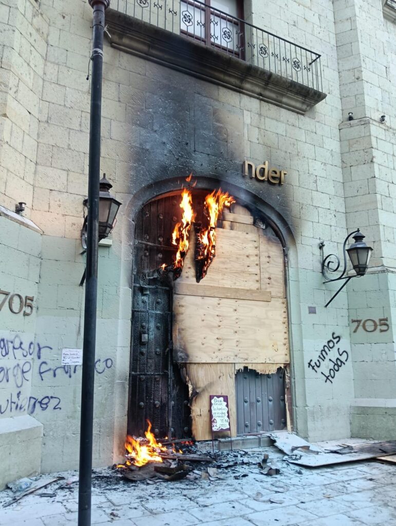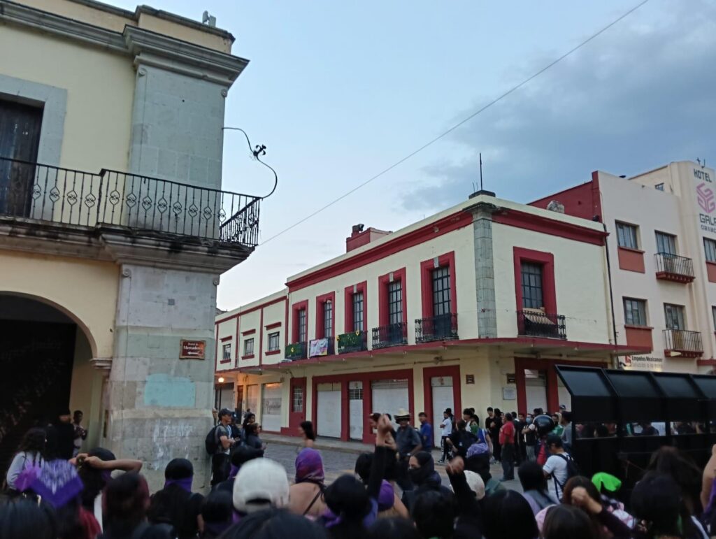 Comenzando el recorrido desde la fuente de las 8 regiones hasta Av. Juárez para entrar al cuadro principal del centro de Oaxaca, como cada año la rabia se expresa interviniendo empresas que contribuyen a alimentar el capitalismo y sostener al imperialismo necrófilo además de financiar Genocidios y sostener la explotación laboral; expresiones que continúan a lo largo del recorrido hasta llegar al Zócalo y la catedral, dónde los nombres de las compañerxs víctimas, los nombres de sus violadores abusadores, asesinos no dejan de escucharse – leerse en las paredes y pancartas de amigos y familiares exigiendo justicia: “¡no somos una no somos 10 pinche gobierno cuéntanos bien! ¡se va caer se va caer el patriarcado se va caer! ¡Vivas se las llevaron vivas las queremos! ¡No se va caer lo vamos a tirar!”