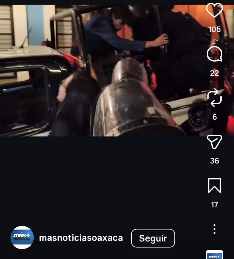 Acto seguido corrimos a tratar de impedir que se lo llevaran, sin embargo comenzó la violencia de los policías, gritando que nos agarraran y aventándonos para no llegar al compañero, lo cual nos resultó imposible, pues eran casi 50 POLICIAS contra 2 mujeres y 1 hombre. Los jaloneos y la brutalidad policiaca no se hicieron esperar para detenernos, a mi amiga la esposaron, a mí me sometieron dentro de la camioneta con una llave para no escapar en palabras de ellos. Nos llevaron al cuartel general del Estado, en San Bartolo Coyotepec, nos negaron el uso de nuestro celular, los nombres de los agentes y el motivo de la detención; además durante el trayecto fuimos violentadas psicólogamente, nos dijeron que no creyéramos que sería una desaparición forzada y que eso nos pasaba por desmadrosas, que tenían videos de nosotras que mejor nos calláramos o nos iba ir peor, los acusamos de secuestro y de violar nuestros derechos.